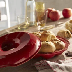 De Emile Henry kroonvormige broodbakpan is gemaakt van zwart geglazuurd aardewerk. De broodbakpan heeft een diameter van 30,5 cm. Dankzij het materiaal van de broodbakvorm bakt u brood met een krokante korst en een zachte binnenkant. Dankzij de bollen in kunt u eenvoudig 8 kleinere broodjes of brioches per keer bakken.