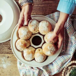 Brood maken met de Emile Henry kroonvormige broodbakpan is heel simpel. Maak een brooddeeg en vorm dit na het rijzen tot 8 kleinere bollen. Leg de bollen in de hollingen van de broodbakpan. Sluit nu de vorm, zet deze in een koude oven en laat de broodbakpan met de oven mee opwarmen. Bak het brood af volgens de recepten uit de meegeleverde flyer.